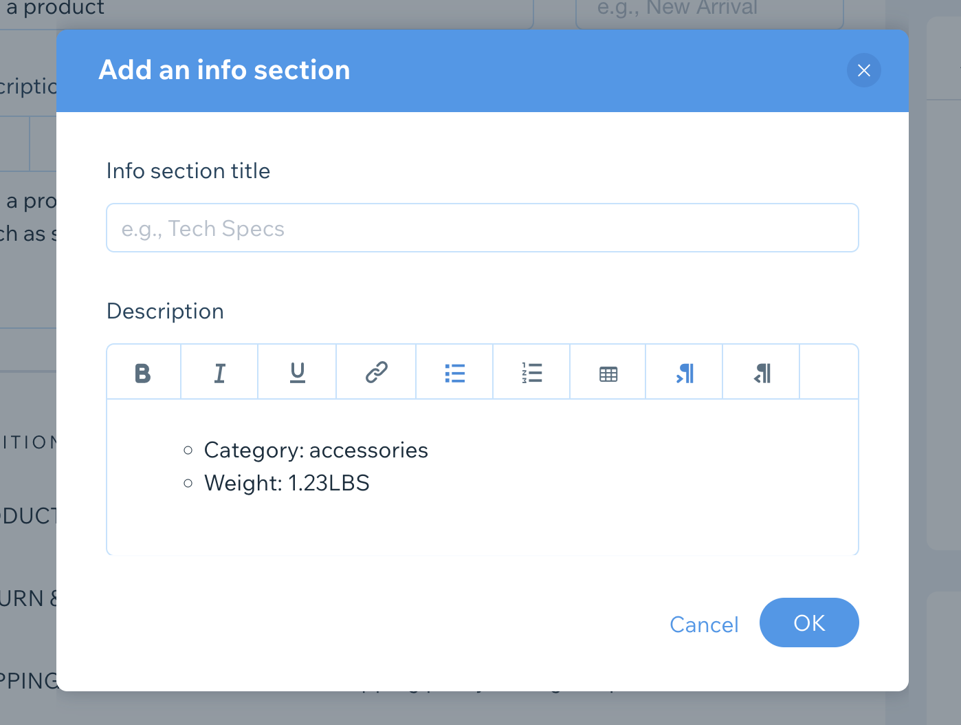 Under "Product info" section, add a new info section or edit an existing one